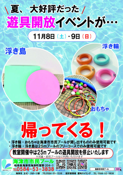 夏に大好評だった遊具解放イベントが帰ってくる!!11月8日(土)と9日(日)に、遊具解放イベントを開催します!⚠️プール教室開催中は、25mプールでの遊具解放を停止いたします。(児童・幼児プールでは利用可能です)同日は無料招待券も配布しているのでぜひ遊びに来てくださいね!
