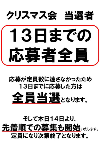 クリスマス会 当選者発表🎉クリスマス会は応募者数が定員数に達さなかったため、13日までに応募した方は全員当選となります!また、14日(日)から先着13名で追加募集も開始いたします。電話での申し込みも可能です☎