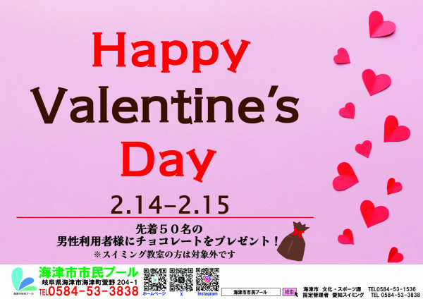 バレンタインデーイベント🍫2月14日、15日の2日間限定で、男性の利用者様にチョコレートをプレゼントいたします!ぜひ海津市市民プールにお越しください✨