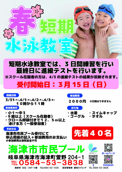 3月31日(火)~4月3日(金)の4日間短期水泳教室を開催いたします!3月15日(日)から申込開始となります。先着40名までですのでお早めにお申し込みください!⚠️海津市市民プール受付にて申込用紙の記入と参加費用の お支払いで申し込みが完了いたします。